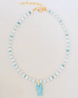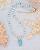 Inspired by the tranquil blues of the French Riviera, the Antibes Gemstone Necklace is a delicate celebration of coastal elegance. Hand-strung with smooth rondelle beads of Amazonite, Apatite, and Jade, this piece radiates soft seafoam and ivory hues that evoke sunlit shores and crystalline waters. At the center hangs a gorgeous carved Amazonite fish pendant.
