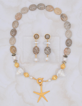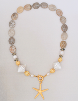 - Fossil Coral, Natural Shells, Pearls, White and Grey Moonstones, Swarovski Crystals, Matte Gold-plated brass