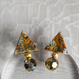 Gold-plated stainless steel posts, gold-plated brass, and the stunning Silver Leaf Jasper are elegantly combined in these Triple Threat Statement Stud Earrings. Embellished with shimmering Swarovski crystals.