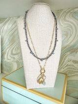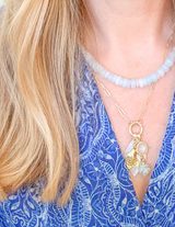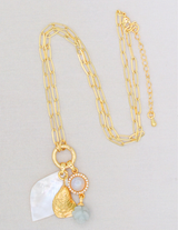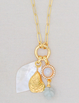Our Duxbury Beach Charm Necklace features a Gold Vermeil Oyster, a spectacular 8mm Rainbow Moonstone, carved Lace Agate rose and glossy Mother of Pearl Shell.