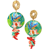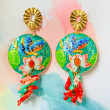 Cloisonné Lily Pad Statement Earrings with Bamboo Coral